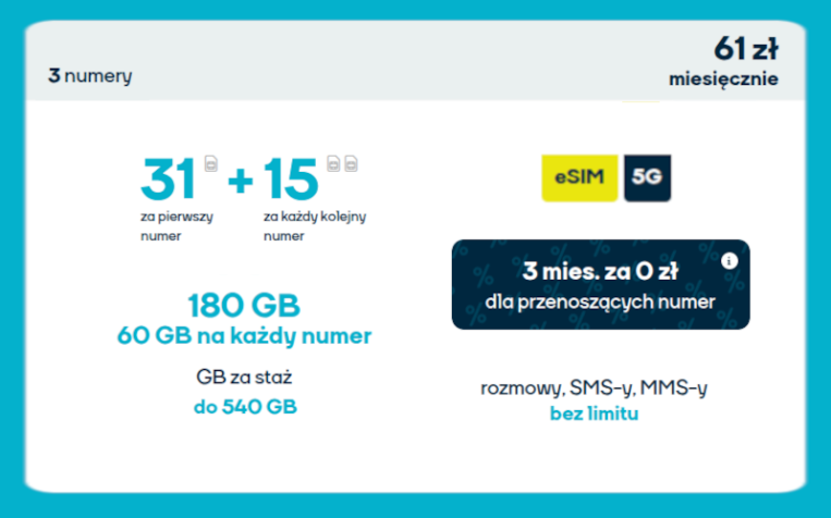 Korzystaj z jednej oferty dla całej rodziny lub kilku urządzeń. Za jedyne 61 zł miesięcznie (31 zł za pierwszą kartę i 2 x 15 zł za kolejne) zyskujesz 3 x 60 GB internetu na start, czyli łącznie aż 180 GB, a za staż nawet 540 GB miesięcznie – po 180 GB na każdą kartę! Dodatkowo w roamingu UE przysługuje Ci 3 x 9 GB, co daje 27 GB bez dodatkowych opłat. Wszystkie rozmowy, SMS-y i MMS-y są całkowicie nielimitowane w kraju i Unii Europejskiej. Zyskujesz również dostęp do nowoczesnej sieci 5G oraz możliwość aktywacji eSIM bez potrzeby używania fizycznej karty SIM – wszystko z poziomu aplikacji mobilnej. Przenosisz numer? Skorzystaj z promocji 3 miesiące za 0 zł (nie dotyczy numerów z Orange i NJU). Elastyczność, oszczędność i pełna kontrola – to właśnie NJU Mobile w pakiecie dla trzech!