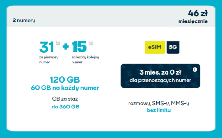 Łącz oszczędność z wygodą – 2 numery w jednej ofercie NJU Mobile! Pierwsza karta za 31 zł, druga tylko 15 zł miesięcznie. Każda z kart otrzymuje 60 GB na start (łącznie 120 GB), a za staż nawet 360 GB miesięcznie – po 180 GB na numer! W roamingu UE zyskujesz po 9 GB na każdą kartę bez dodatkowych opłat. Rozmowy, SMS-y i MMS-y bez limitu – w kraju i całej Unii Europejskiej. Dodatkowo możesz korzystać z szybkiego internetu 5G i aktywować eSIM bez wychodzenia z domu – wszystko dostępne w intuicyjnej aplikacji NJU. A jeśli przenosisz numer spoza Orange i NJU, otrzymujesz aż 3 miesiące za 0 zł! Idealna oferta dla par, rodziny lub dwóch urządzeń. Bez zobowiązań, bez ukrytych kosztów – korzystaj z wolności, jaką daje NJU!