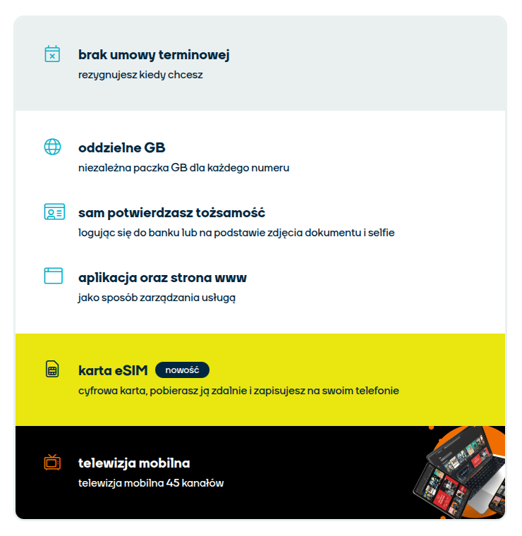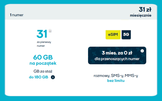 Zyskaj pełną swobodę komunikacji z NJU Mobile. W cenie 31 zł miesięcznie otrzymujesz aż 60 GB internetu na start, a za staż możesz zgromadzić nawet do 180 GB! Dodatkowo 9 GB do wykorzystania w roamingu UE bez dopłat. Rozmowy, SMS-y i MMS-y bez limitu – zarówno w Polsce, jak i w Unii Europejskiej. Korzystaj z nowoczesnych rozwiązań: dostęp do sieci 5G oraz możliwość aktywacji eSIM – wszystko wygodnie w aplikacji NJU. Dla nowych klientów przenoszących numer od innego operatora (z wyłączeniem Orange i NJU) przygotowano promocję – 3 miesiące za 0 zł! Brak długoterminowych umów – pełna elastyczność i przejrzystość warunków. Oferta idealna dla osób ceniących niezawodne połączenia, szybki internet i wolność wyboru. Przenieś numer, zyskaj więcej i płać mniej z NJU!