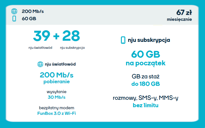 Zyskaj niezawodny internet domowy i tani abonament komórkowy w jednej, elastycznej ofercie! NJU światłowód o prędkości 200 Mb/s (30 Mb/s wysyłania) kosztuje tylko 39 zł miesięcznie, a w zestawie z nim możesz dobrać subskrypcję NJU z kartą SIM za jedyne 28 zł. Łącznie płacisz tylko 67 zł/mies. – bez umowy na czas określony, z jedną fakturą i pełną swobodą rezygnacji. Światłowód działa na sprawdzonej infrastrukturze, a modem FunBox 3.0 z Wi-Fi otrzymujesz bezpłatnie. Subskrypcja obejmuje nielimitowane rozmowy, SMS-y i MMS-y w kraju i UE oraz pakiet 60 GB internetu na start, który rośnie do 180 GB wraz ze stażem. Usługa wspiera 5G i umożliwia aktywację eSIM. Jeśli przenosisz numer z innej sieci – zyskujesz 3 miesiące za 0 zł! To wygodne, tanie i nowoczesne rozwiązanie dla każdego domu. Postaw na NJU – internet i telefon bez zobowiązań, z rabatem i wygodą w jednej ofercie!