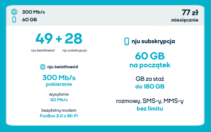 Wybierz pakiet idealny dla domu i telefonu – bez zobowiązań, z jedną fakturą i realnymi oszczędnościami! NJU światłowód o prędkości 300 Mb/s (30 Mb/s wysyłania) to tylko 49 zł miesięcznie, a dzięki niemu zyskujesz zniżkę na subskrypcję komórkową – zamiast 31 zł płacisz tylko 28 zł. Łącznie za obie usługi zapłacisz jedynie 77 zł/mies.. Światłowód działa na sprawdzonej sieci z bezpłatnym modemem FunBox 3.0 i Wi-Fi, bez umowy na czas określony. Do tego subskrypcja z rozmowami, SMS-ami i MMS-ami bez limitu w Polsce i UE oraz internetem rosnącym za staż – od 60 GB na start do nawet 180 GB miesięcznie. Masz dostęp do 5G, możesz aktywować eSIM, a jeśli przenosisz numer z innej sieci – zyskujesz dodatkowo 3 miesiące za 0 zł. To wygodne i nowoczesne rozwiązanie dla tych, którzy chcą płacić mniej, mieć wszystko w jednej sieci i nie wiązać się umowami. Sprawdź dostępność i zacznij oszczędzać już dziś!